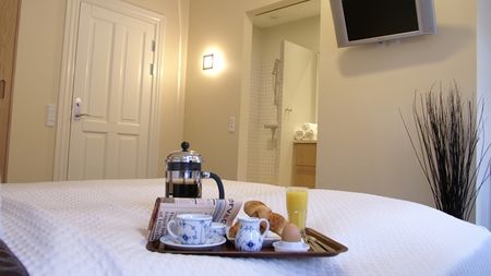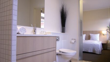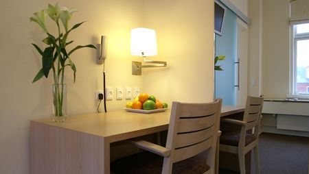 Værelset har rigtig gode boksmadrasser, sengetæppe, altid 2 puder per person, fladskærms tv, skrivebord, radio, telefon, stort garderobeskab m.m.