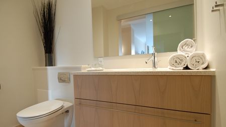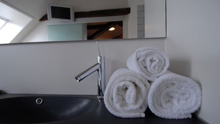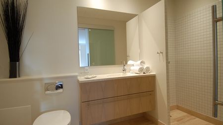 Badeværelse er udført i gode materialer: gulv i italiensk travertin, Philip Starc armaturer, sæbe og shampo m.m.